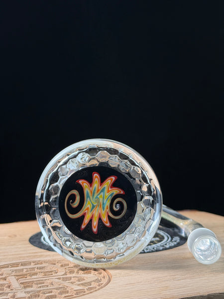 One of the first banger mugs with a full Gold dichroic 18 mm fitting handle! This beautiful 8 ounce mug features a black and rainbow wig wag in the base. Telamagenta, drips, and gold dichroic in the handle. Comes with Q-tip straw, Stickers, moodMatt, and certificate of authenticity!