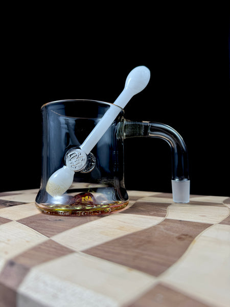 This golden Squash Banger is perfect for those mornings while you welcome the sun and think about that summer garden. I pressed this one onto an Acorn squash. Giving it a really unique texture on the base that was then covered with 22 karat gold. Holds 13 oz. Accented with electrum and gold dichro where the handle meets the mug. Comes with a unique shortened Q-tip straw. Comes with a certificate of authenticity, stickers, and mood mat