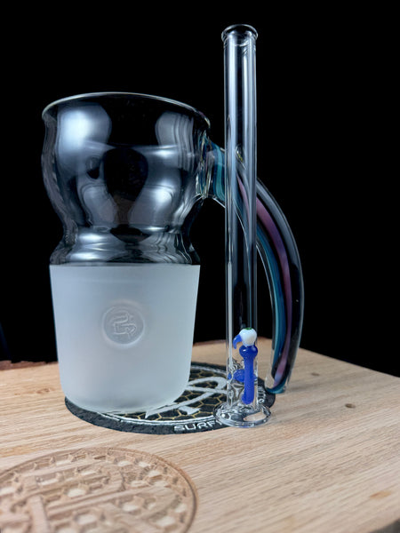 this beautiful horn slide mug features A purple/red and blue spectrum colored way on the handle . Accented with a sunflower Millie. Holds just over 20 ounces. The mini tube straw has a lapis and white color way with a 4 hole filter   Comes with stickers, mood mat, and certificate of authenticity