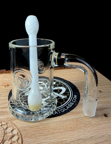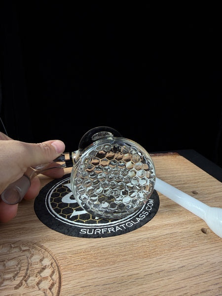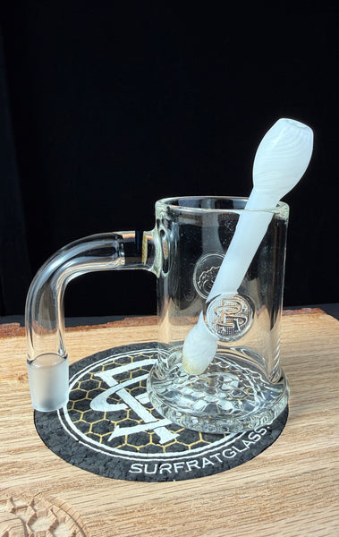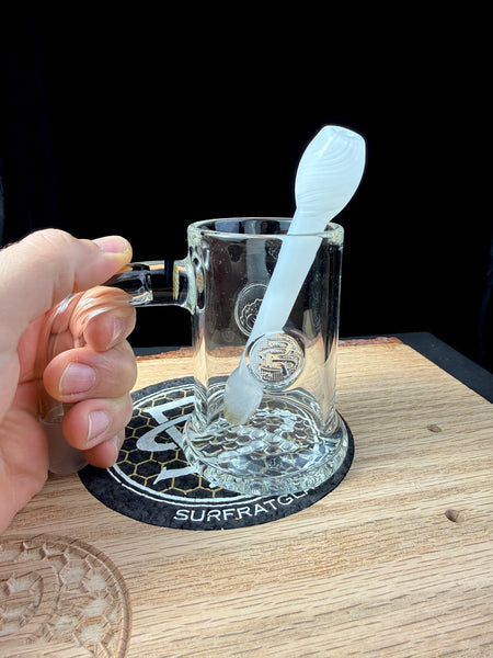 This 5 ounce bangin mug features a 19mm fitting handle, signature stamps, and honeycomb bottom. Perfect for a cappuccino or spirits. Black galaxy and honeycomb Millie, where the handle meets the mug.