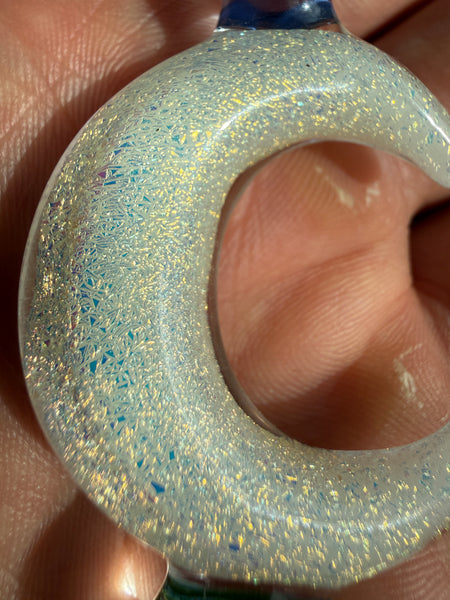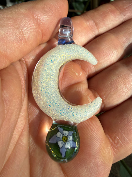 This beautiful crescent, moon pendant features ultra, rare glow glass wrapped with gold dichroic glass and a Columbine flower "tear drop". Shines beautifully bright in the daytime and glows for hours in the evening. Charged easily with sunlight or UV light. accented with a gold dichro combine