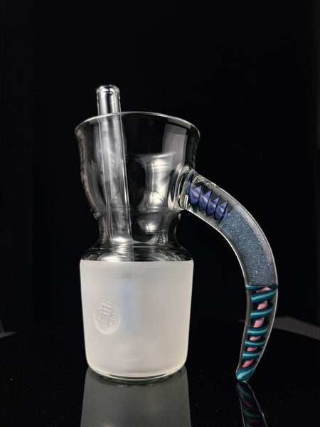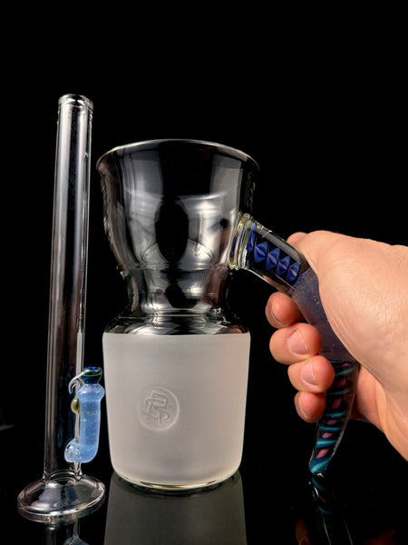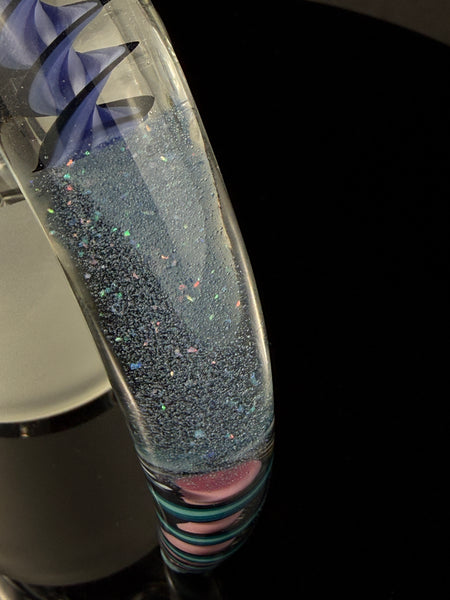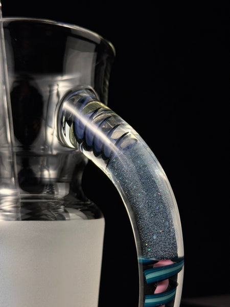 This beautiful horn handle slide mug holds around 12 fl oz. Features a three section horn handle with blue and purple spiral cane, and crushed opal blue v. in the center. Signed in the “frosted fitting” with the Surf Rat Glass insignia. Comes with stickers, moodmat and certificate of authenticity.