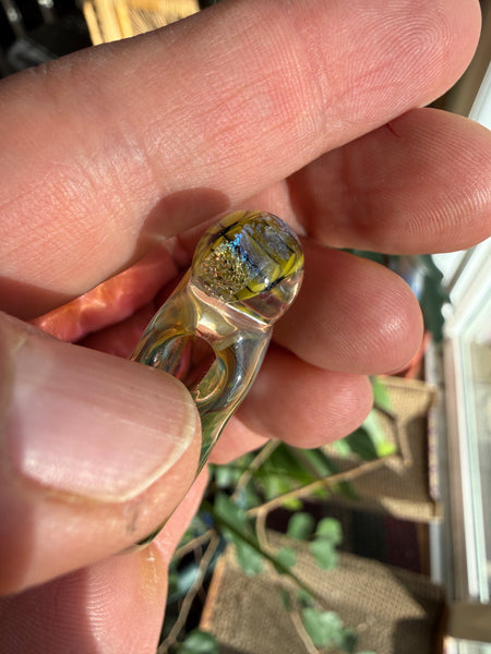 This is my favorite from the road trip fume collection. This was a themed desert trip with bats, flying in the air on one side and mountains on the other. I love how you can see through one side to see the mountains in the distance. Give me an awesome double sided accent. Along with the gold and silver perfume, blinking things out nicely accented with a dichro lined sunflower on top.